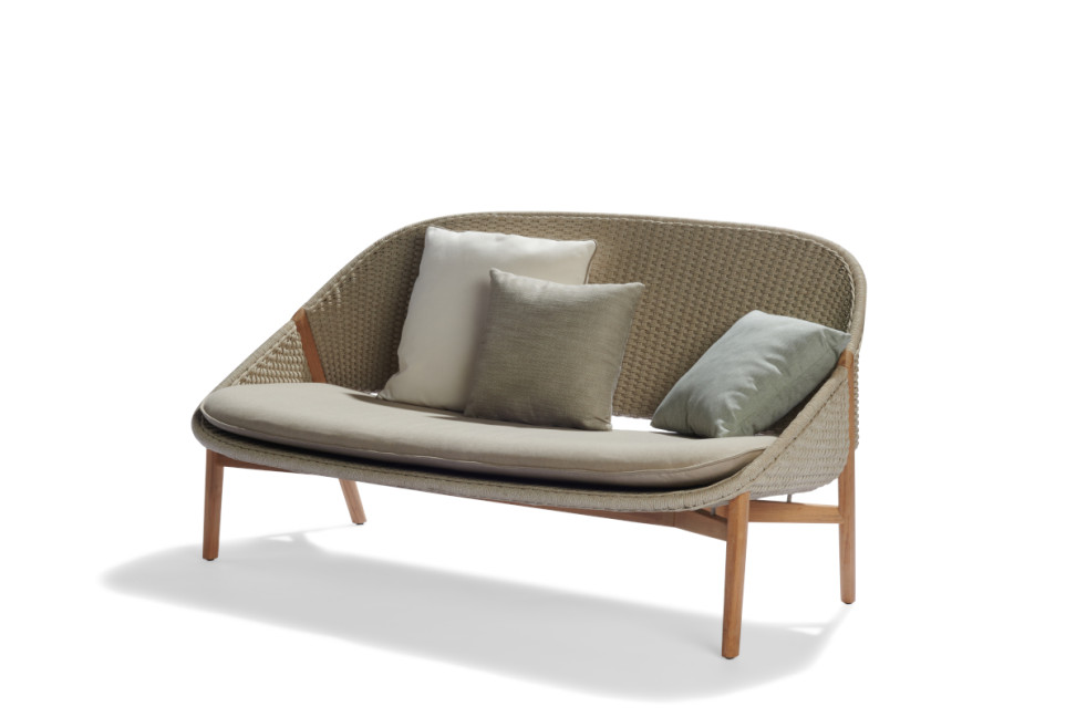 Il divano per esterno Elio, progettato dal designer Yabu Pushelberg in collaborazione con il brand Tribù, è caratterizzato da una seduta dalla forma accogliente, leggermente arrotondata verso l'interno, sorretta da una struttura in teak naturale, in cui si distinguono le importanti gambe posteriori. Le sedute sono in corda intrecciata Tricord, tutte lavorate a mano tessendo insieme filati di diversi colori, rendendo ogni pezzo unico nel suo genere.
