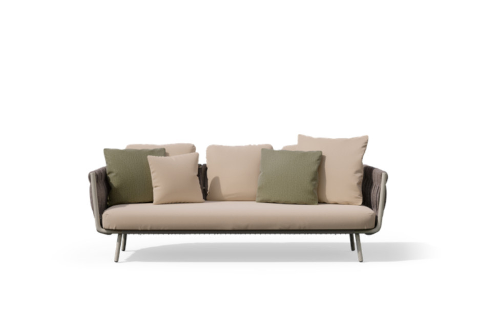 La seduta è molto confortevole grazie ai cuscini outdoor. I tenui colori ton sur ton in linen sottolinea il caratere chic di questo sofa.