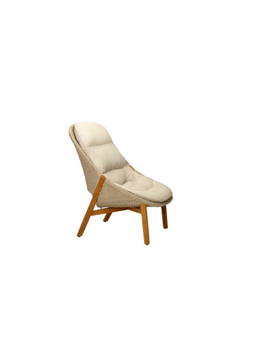 La poltroncina Elio, di Yabu Pushelberg per Tribù, presenta una accogliente seduta ampia e profonda con schienale alto, completamente rivestita da un comodo cuscino che le dona un comfort ulteriore. La struttura, sostenuta principalmente dalle gambe posteriori, è in teak naturale e la seduta, tessuta a mano, è disponibile nei colori Linen, Wengè e Moss. La linea di sedute Elio, che oltre alla poltroncina con schienale alto, comprende anche una poltrona, un divano e una sedia, è caratterizzata da una tessitura con fili di corda Tricord in varie sfumature leggere di colore che restituiscono l'impressione delle sfumature naturali della luce del tramonto, rendendo così caldo ed accogliente qualunque ambiente outdoor.