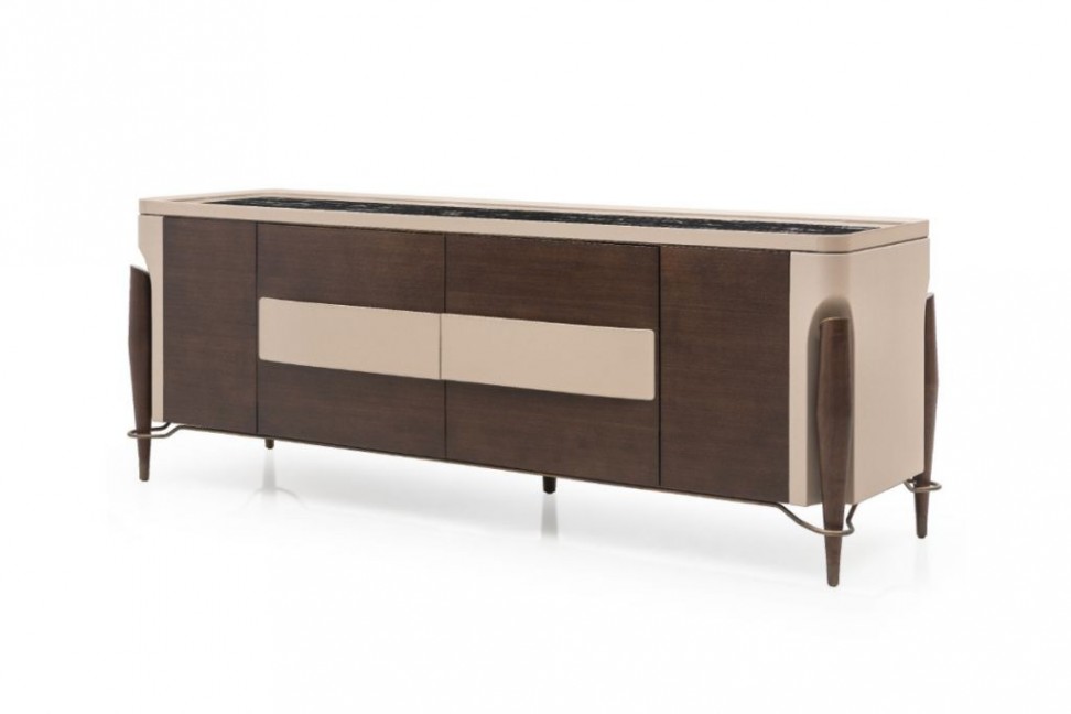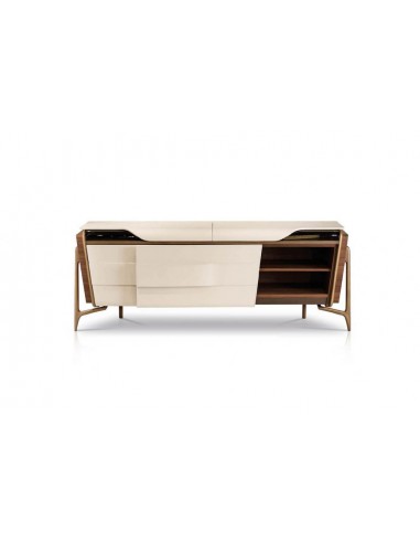 Le credenze della collezione Melting Light sono disegnate da Frank Jiang per il brand made in Italy Turri e sono disponibili in due modelli: con ante frontali scorrevoli e con 4 ante a battente. La prima versione è dotata di vani superiori con ante a ribalta, mentre la parte frontale può essere rivestita in pelle oppure in legno naturale. La versione con ante a battente ha struttura in legno naturale, inserti in pelle e top in marmo.