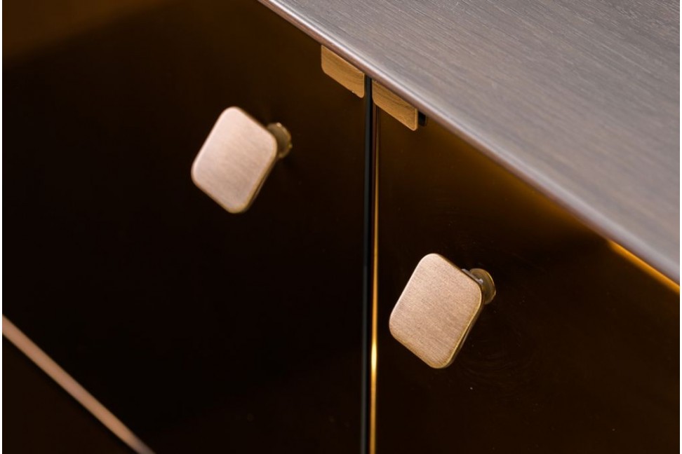 La credenza Vine, disegnata da Frank Jiang per Turri, ha una struttura mista tra legno e vetro a dare un senso di alternanza tra spazi aperti e spazi pieni.