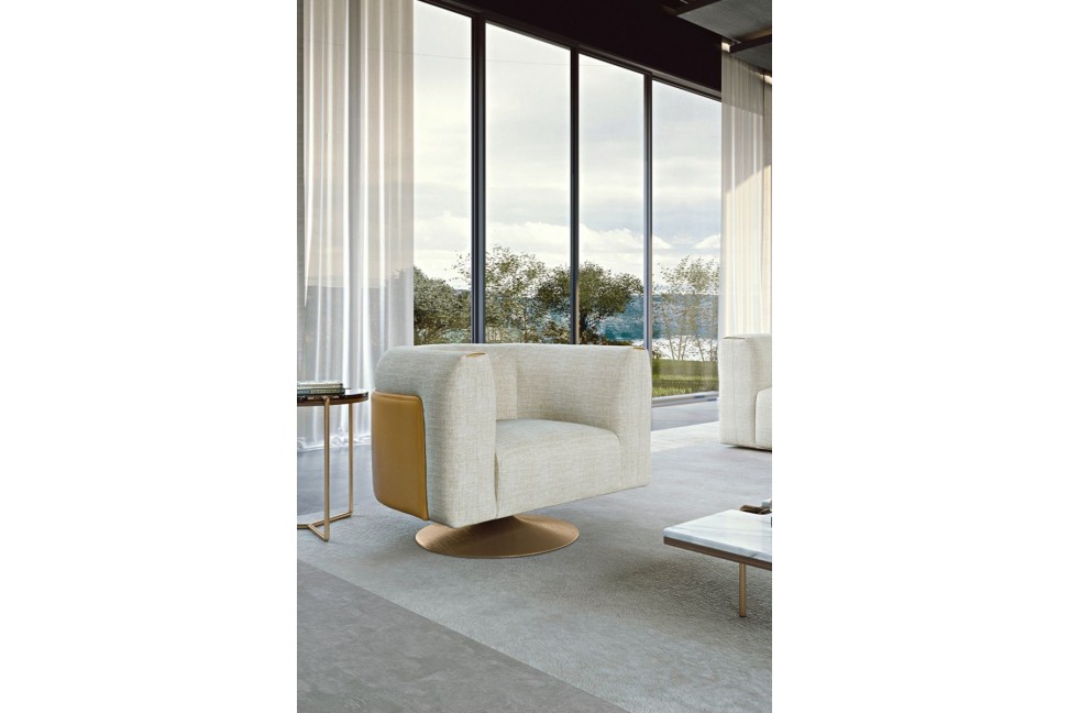 La poltrona della collezione Soul, novità 2021 del brand Turri, ripropone il concept del divano con la stessa struttura avvolgente, arricchita sul retro da un pannello in pelle. La base in metallo è disponibile in versione fissa o girevole. La poltrona Soul è rivestibile in pelle o tessuto o in un mix dei due.Turri
