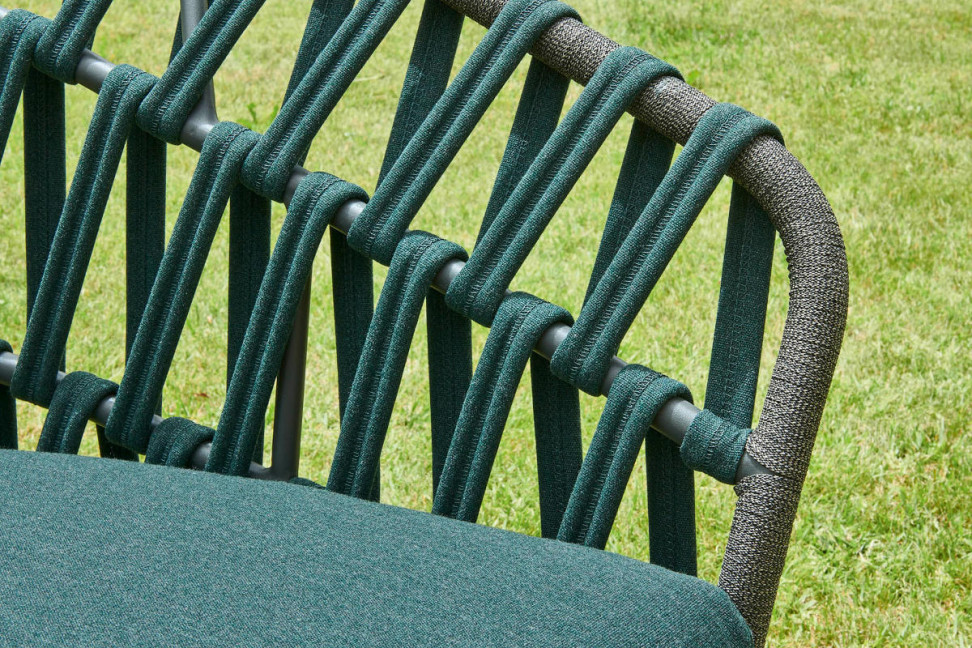 La struttura della poltrona da esterno Emma Cross è realizzata in alluminio verniciato a polvere, con un intricato intreccio di nastro in tessuto acrilico. Il rivestimento del sedile, in tessuto resistente, è imbottito con gomma Dryfeel® da esterno, assicurando un comfort eccezionale e una durabilità superiore anche nelle condizioni atmosferiche più avverse.