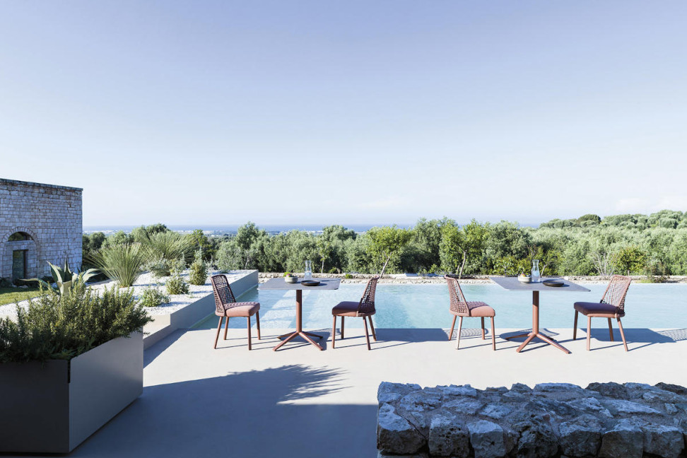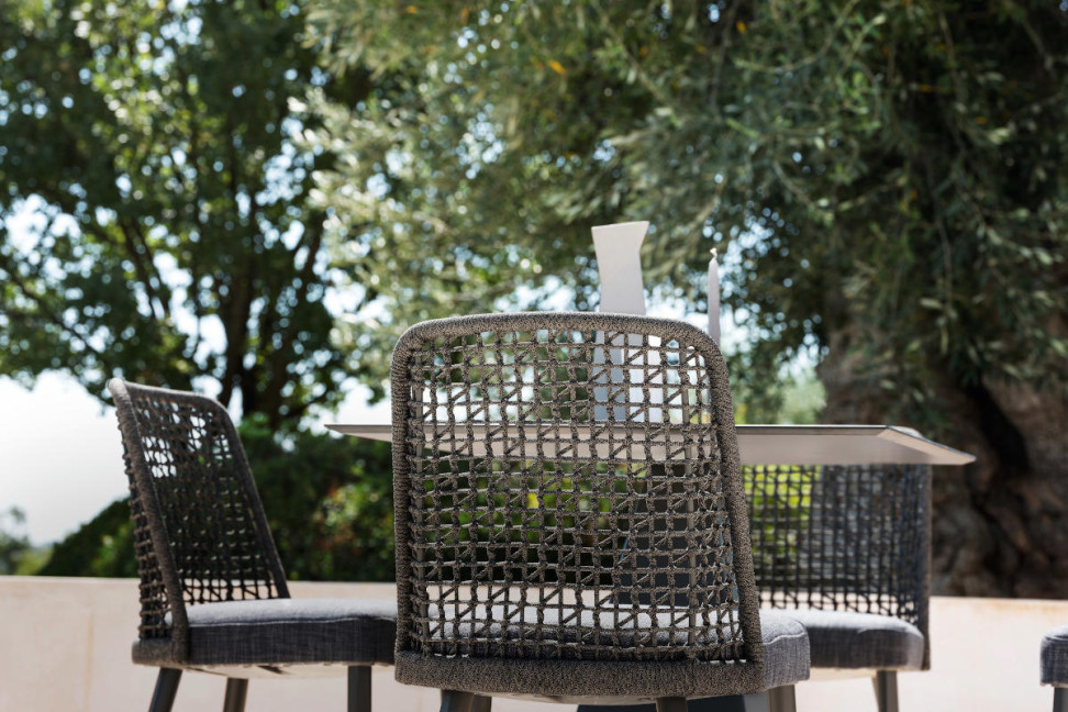La sedia outdoor Emma di Varaschin, ideata dalla designer Monica Armani, presenta un look elegante e mediterraneo.