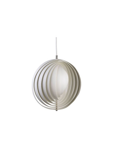La lampada sospesa Moon è un'icona di stile ed eleganza, è formata da 10 anelli morbidi in metallo sovrapposti che si aprono a ventaglio intorno ad una lampadina centrale che rimane nascosta. I dischi, che ricordano le fasi lunari, diffondono nell'ambiente una luce diffusa e avvolgente. Moon è un elemento di arredo che stupisce e cattura lo sguardo. Verpan realizza questa lampada in tre dimensioni: cm Ø 34, cm Ø 44,5 e cm Ø 150, con finitura bianca o rame.
