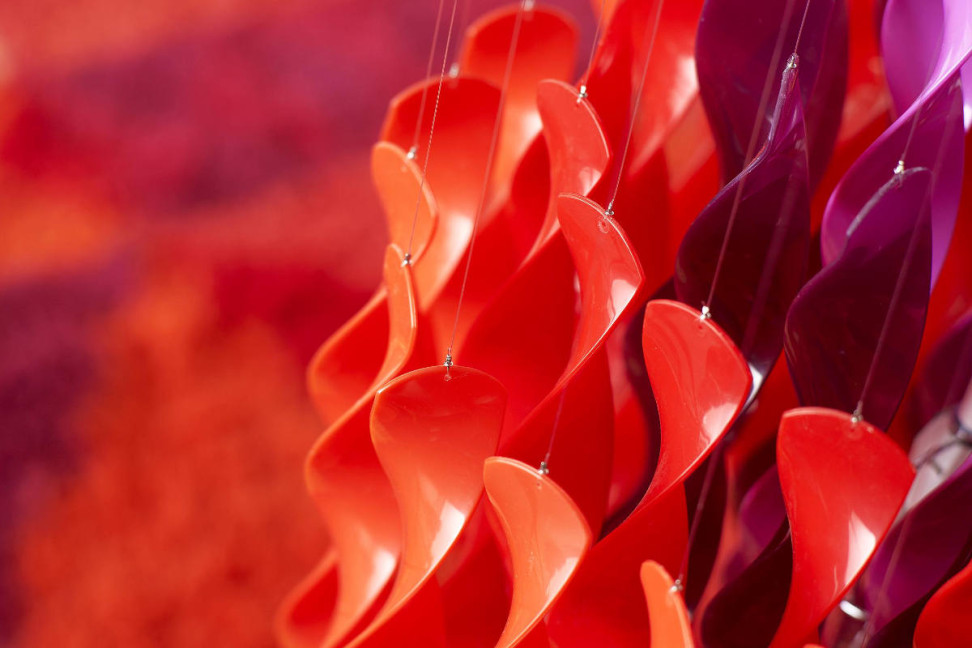 La collezione include lampade sospese di diverse dimensioni, piccole, grandi e monumentali, con spirali colorate, dorate o argentate.