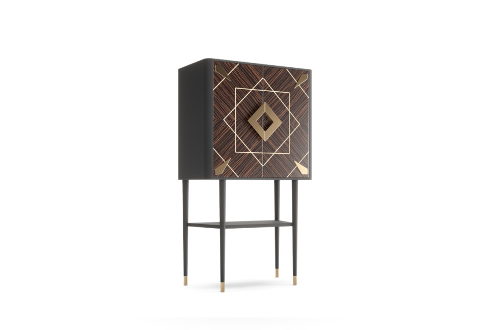L'utilizzo di legno d'acero intarsiato con Ebano Makassar, abbinato a maniglie placcate in oro, conferisce al Mobile Bar Spirit un carattere senza tempo, distinguendolo fortemente dagli altri mobili soggiorno sul mercato. L'interno è fornito di ripiani speciali per esporre con eleganza bottiglie e bicchieri, luci con accensione automatica e uno schienale a specchio che apporta luminosità all'ambiente interno.
