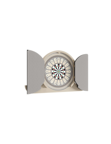 Il mobile è protetto dai colpi grazie a una raffinata gomma con un design geometrico, abilmente posizionata intorno al bersaglio e all'interno delle ante, preservandone così il fascino inalterato. Il Mobile Freccette Argo20 include due set di dardi da 3 pezzi ciascuno, disposti in spazi laterali dedicati.