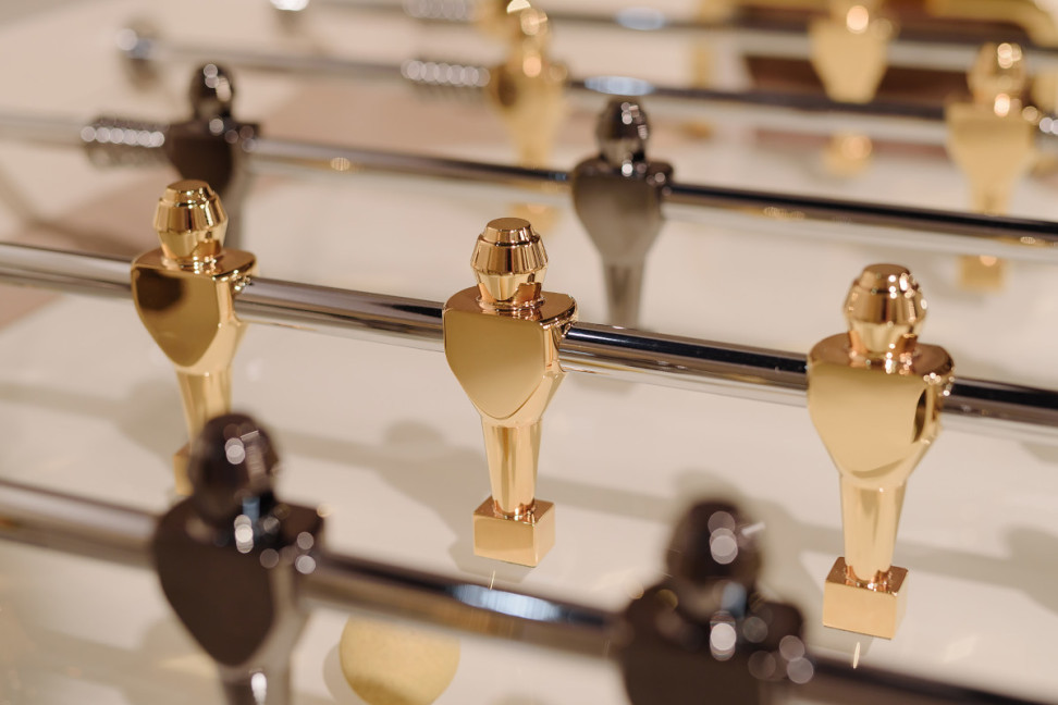 L'eleganza del Tavolo da Calcio Balilla Stadium di Vismara Design, ideato da Pino Vismara, emerge in ogni dettaglio, dagli acciai dorati e cromati dei giocatori alle palline da gioco in sughero.