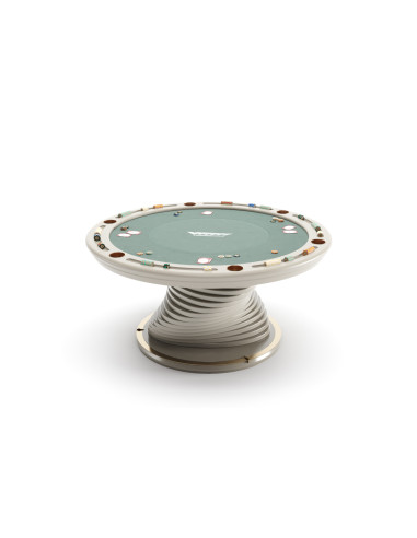 La base del Tavolo da Gioco Mirabilia è un'autentica opera d'arte, caratterizzata da una complessa struttura elicoidale ottenuta dalla sovrapposizione di anelli in legno laccato. Oltre alla sua estetica mozzafiato, Mirabilia comprende eleganti porta bicchieri in acciaio incassati nel top, che conferiscono un tocco moderno al design e distinguono il prodotto dagli altri tavoli da gioco.