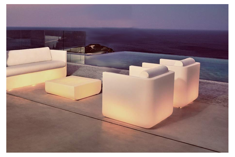 Il divano da esterno Ulm è personalizzabile nella struttura e nel rivestimento dei cuscini grazie ad una vasta gamma di colori della collezione Vondom. Disponibile anche la versione con luci LED.