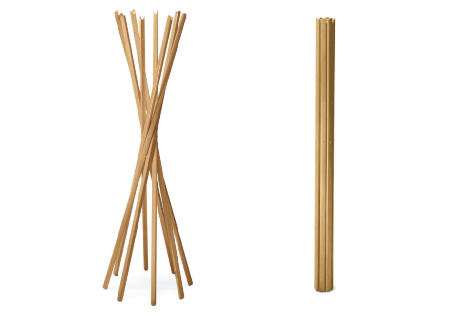 Zanotta realizza questa vera e propria opera d'arte con una struttura molto semplice, composta da otto listelli lunghi 160 cm, fissati più o meno al centro, con un perno, ad una piccola struttura interna che li tiene uniti ma, allo stesso tempo, li fa "cadere" simultaneamente fino a raggiungere l'inclinazione giusta per svolgere la funzione di appendiabiti, simulando il famoso gioco. Aperto l'altezza dell'appendiabiti scende da 160 a 145 centimetri. I listelli sono realizzati in legno di faggio, rovere di diverse colorazioni oppure al naturale.
