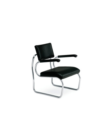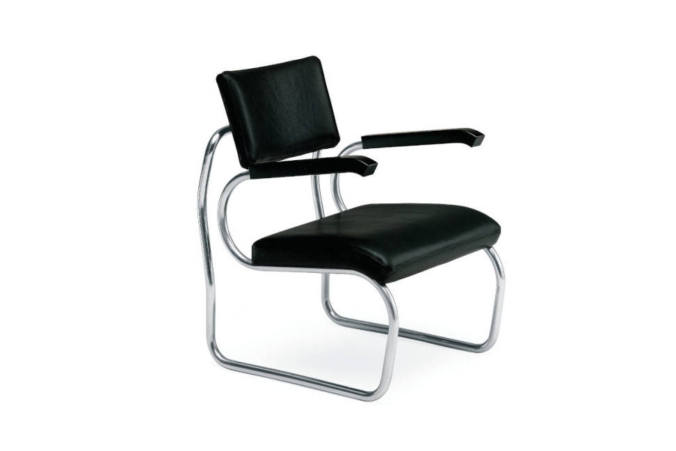 La poltroncina Sant’Elia è una seduta di design pratica e con pochi fronzoli, la cui estetica è costruita sul contrasto tra acciaio e pelle.