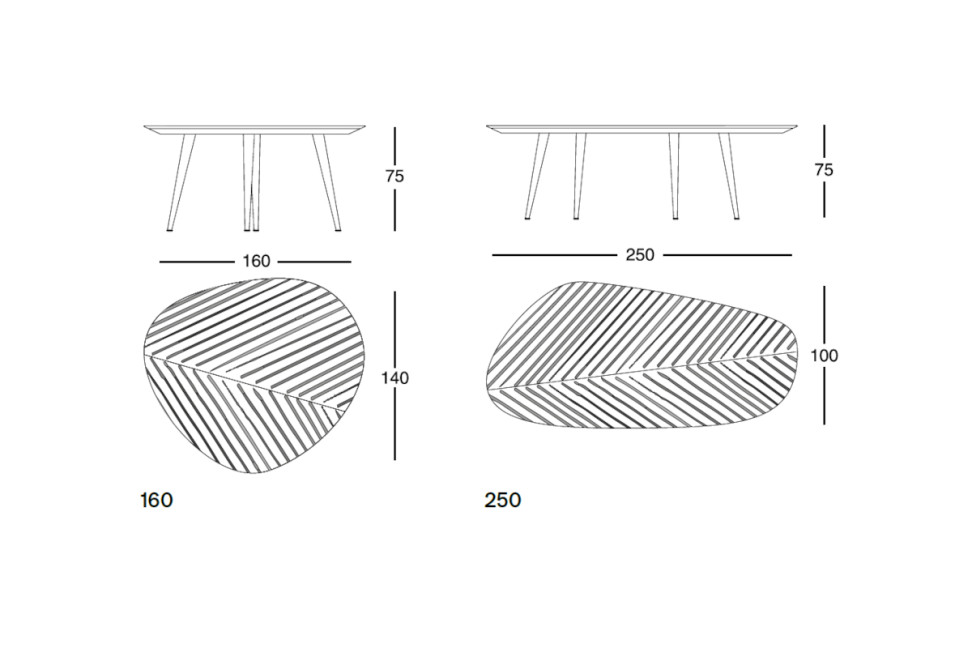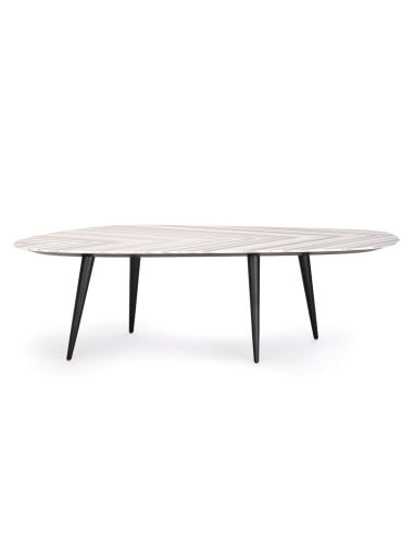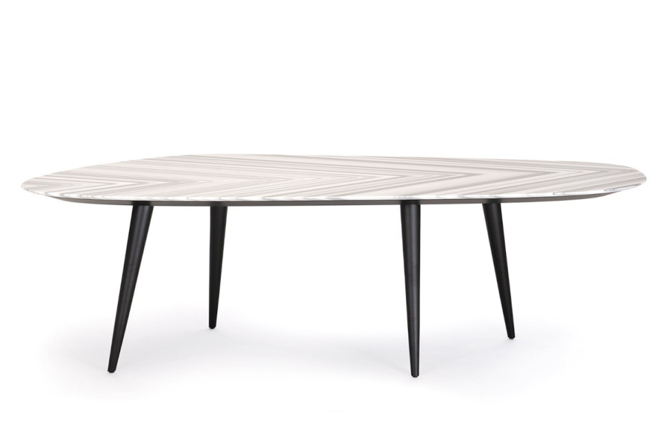 La collezione di tavoli Tweed si distingue per la forma organica e irregolare dei piani, che sono caratterizzati da una lavorazione sofisticata della superficie del materiale, trasformandola in un elemento decorativo. La versione Tweed Marble introduce un piano in marmo Striato Olimpico, che è bianco con venature grigie orizzontali molto disegnate. Questa interpretazione del progetto mantiene il concetto originale di utilizzare le venature naturali del materiale (in origine il legno, ma in questo caso il marmo) per creare un segno grafico che si integra con la linea diagonale che divide il piano, simile a una foglia.